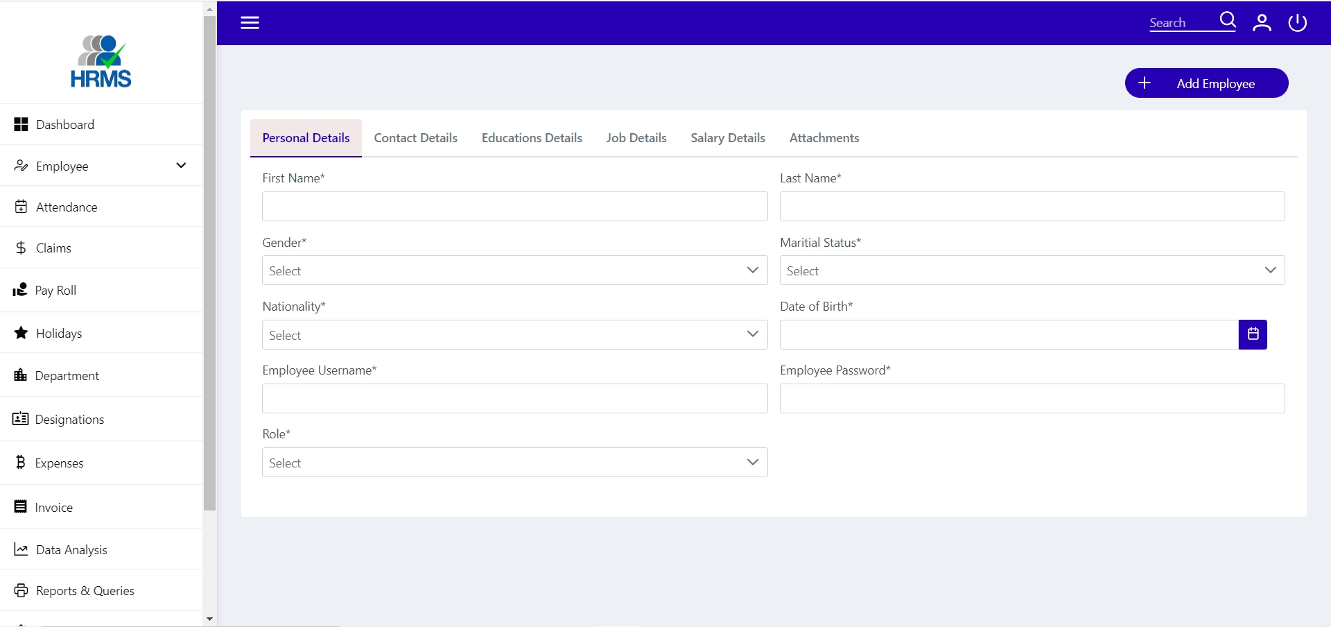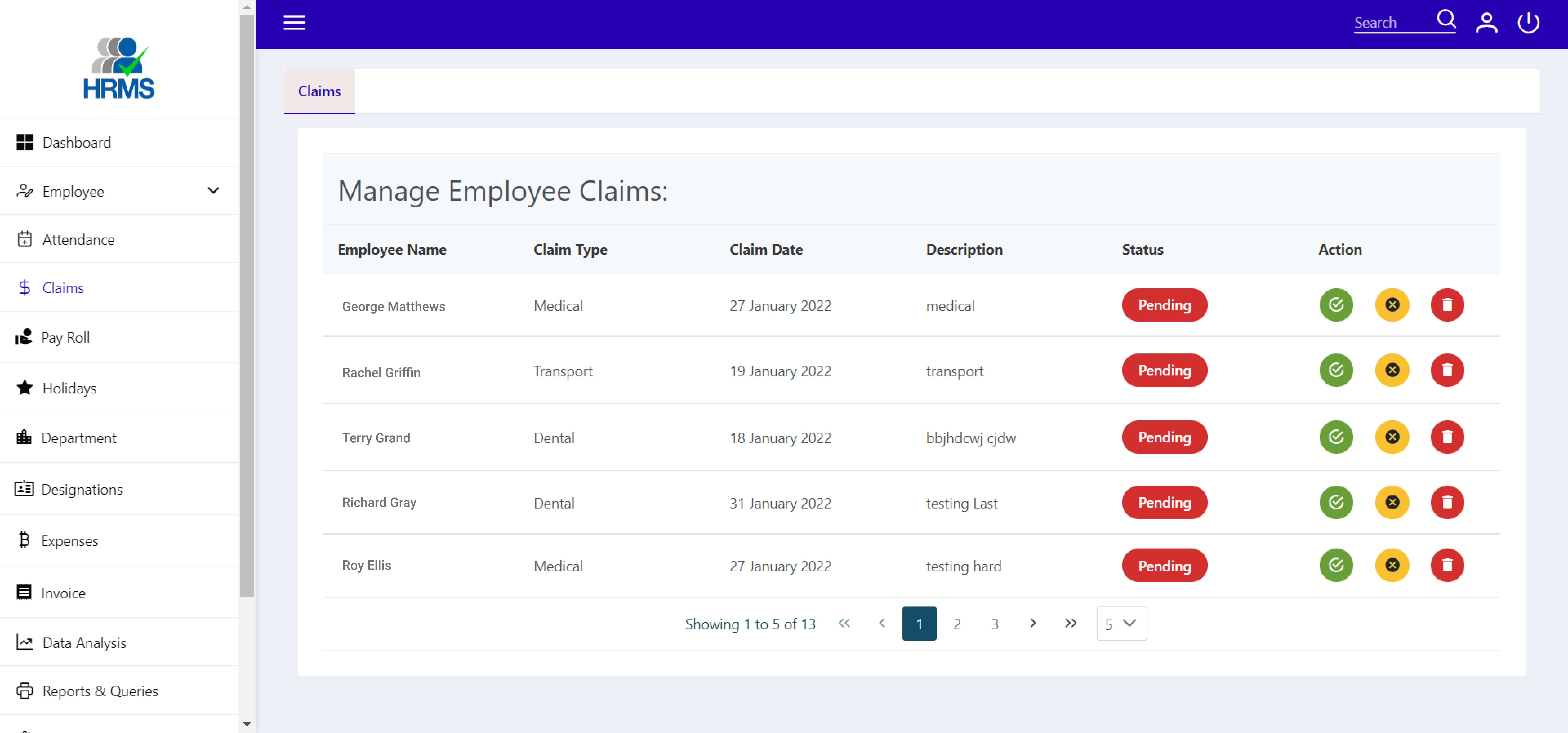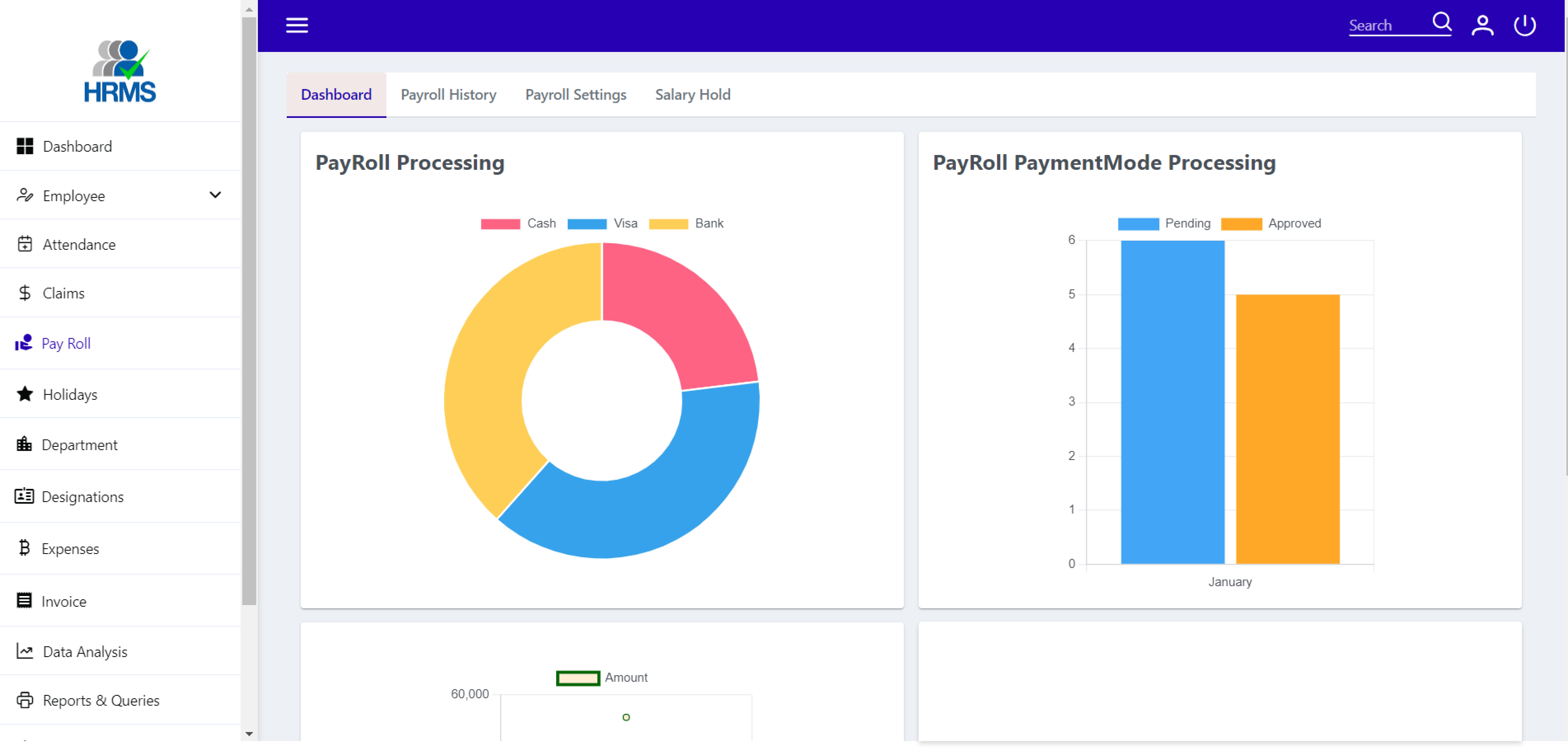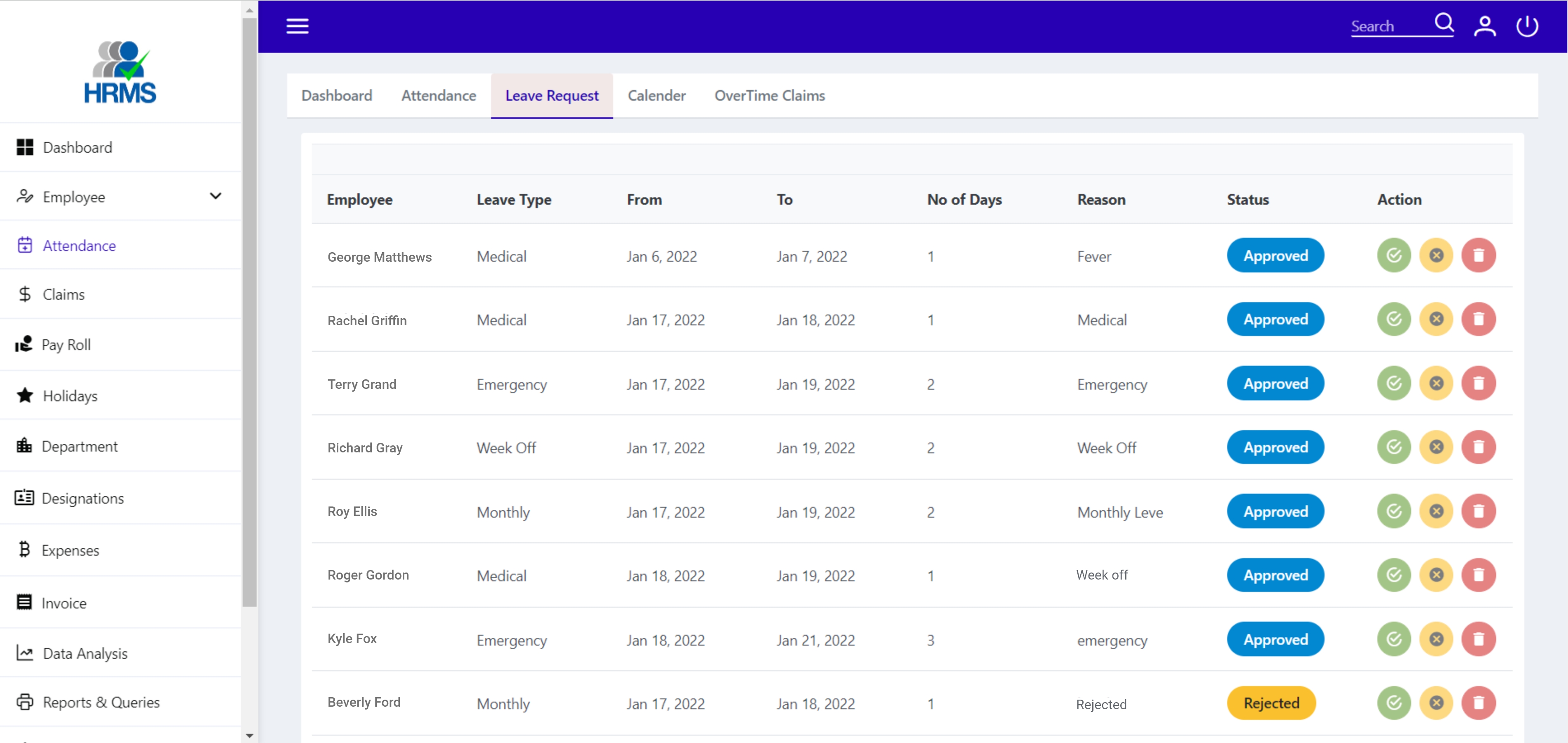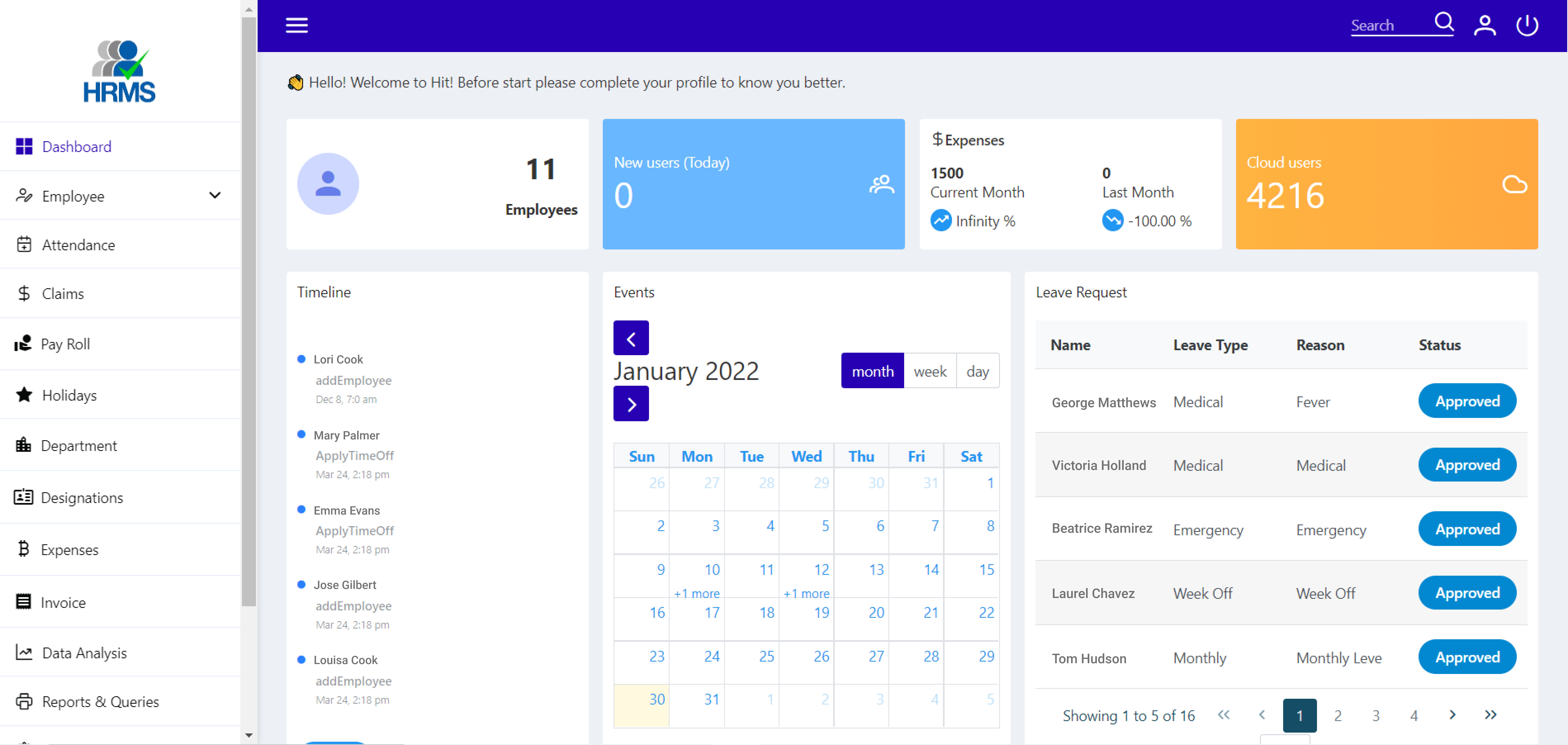 The system can display statistical data such as total leave by day, the number of active Departments, active designations, and pending claims, among other things.