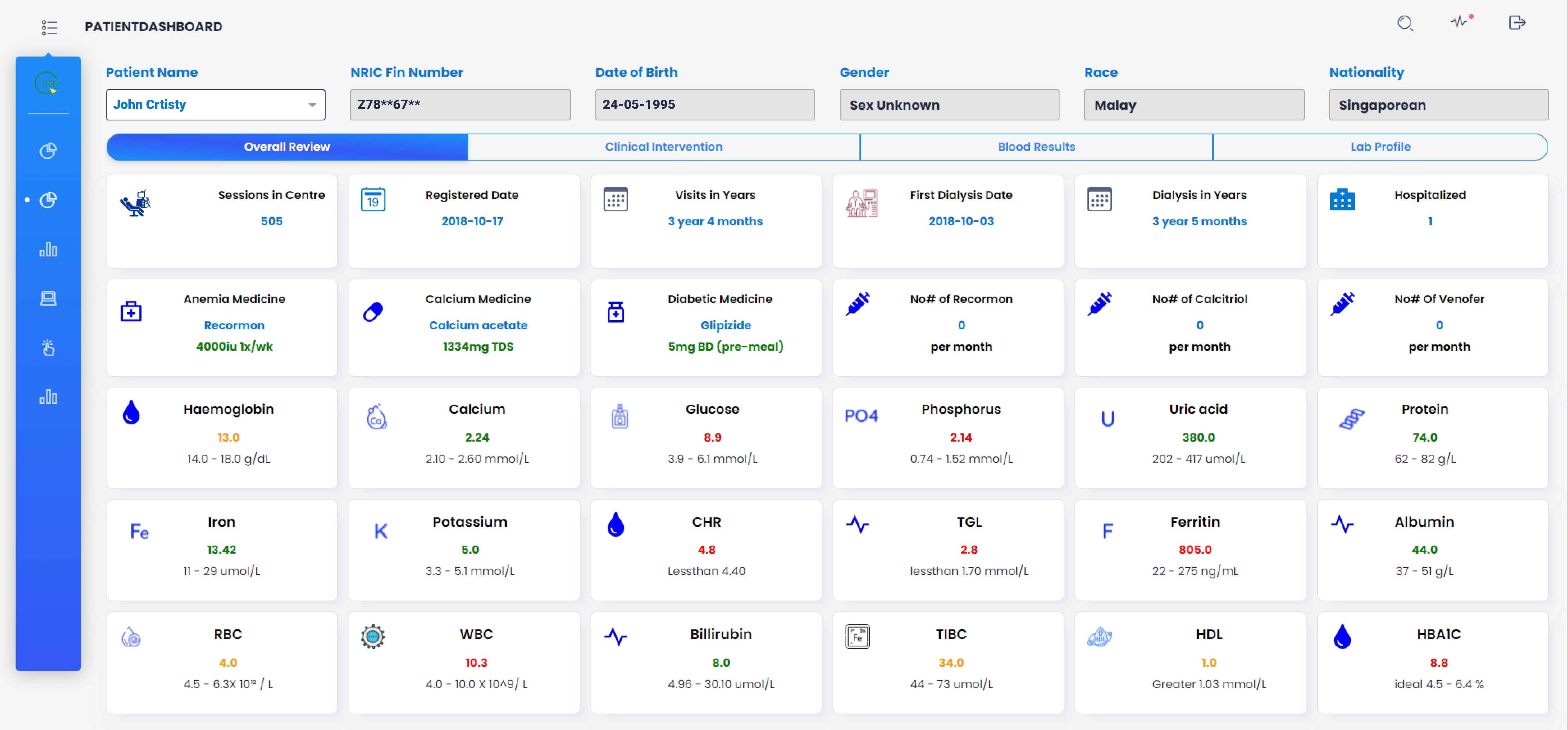 In our Dashboard, we offer a feature called Advanced digitalized patient Demography. A graph view is used to present the precise Hemodialysis therapy data and patient lab results. Using business intelligence software.